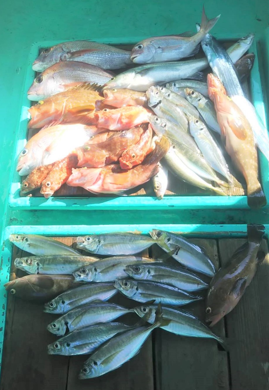 広島県呉市仁方発遊漁船七海です。 今日はタイ、アジ狙いで出てきました。 今日はかっちゃん、とくちゃんグループで出船でした。 朝一はタイ狙いの予定がアジに変更。 良いサイズのアジが釣れてくれますね。 潮どまり前後にタイ狙いをしてみましたが、タイの反応がいまいち 代わりにアコウが釣れてくれました。 型はそこそこでしたが、結構数が釣れてくれましたよ。 釣果情報 2019/09/14 遊漁船 七海 タグ:釣果情報 , タイ , アコウ , カサゴ , 一つテンヤ , スズキ , アジ