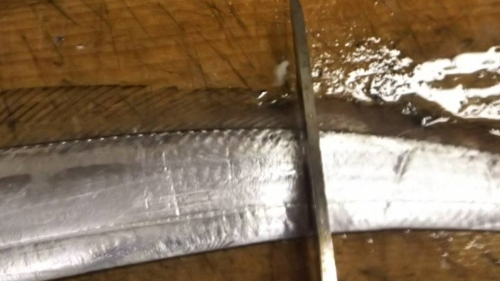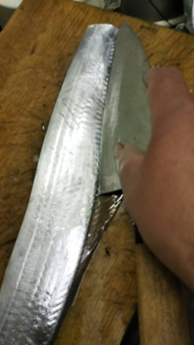 先ほど切った頭のほうへ包丁を入れていきます。