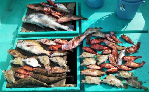 広島県呉市仁方発遊漁船七海です。 今日は一つテンヤしてきました。 今日はOKさんとM下さん、O窪さんグループで出船。 朝一、一流し目から良いサイズのアコウが顔を見せてくれました。 潮が流れ出してからはカサゴやセトダイ、タイなど色々な魚が 楽しませてくれました。 今回初参加のM下さんも良いサイズのアコウをゲットしてくれました。 後半戦には大型のコショウダイも、一つテンヤ初挑戦の女の子が頑張って上げてくれました。 釣果情報 2020/09/21 遊漁船 七海 タグ:釣果情報 , タイ , アコウ , カサゴ , 一つテンヤ , セトダイ , アジ , ギザミ , グチ , コチ , コショウダイ