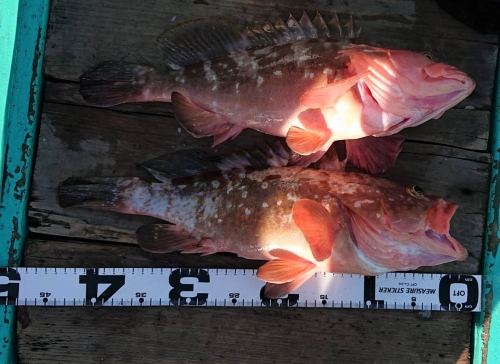 朝の潮ゆるみには45センチアップの良型アコウが連発。