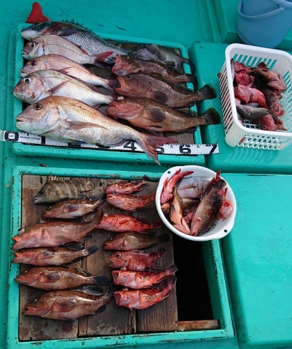 広島県呉市仁方発遊漁船七海です。 今日は一つテンヤ、胴付き便してきました。 今日は白さん、O本さん、今回初参加のtナカさん達と出船。 朝は一つテンヤ、ミックスでスタート。 カサゴに、アコウと良い感じ。 途中良い反応が出てタイも喰ってきました。 中盤から後半にかけてはサビキ、胴付きでタイ狙いをしてみましたが タイの反応はいま一つでしたね。 アコウは反応良かったですよ。 釣果情報 2020/11/03 遊漁船 七海 タグ:釣果情報 , タイ , アコウ , カサゴ , 一つテンヤ , セトダイ , ギザミ , ウマヅラハギ , カワハギ