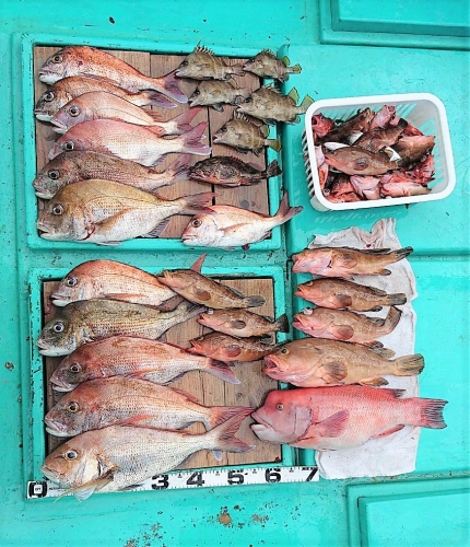 広島県呉市仁方発遊漁船七海です。 今日は一つテンヤしてきました。 今日は片さんと、福君達と出てきました。 朝から一つテンヤ スタートからポツポツ当たって来てくれました。 前日に比べて活性は高くなかったみたいですが最後までポツポツ釣れて 上がってみたら良い感じでした。 遊漁船七海では二人体制でやっていますのでしっかりサポートさせていただきます。 初めて遊漁船に乗られる方でもお気軽にご連絡ください。 餌のエビはシーズン中はしっかり用意させていただきます 釣った魚は下処理をしてお持ち帰りいただけます。 コロナ対策のためマスク着用ご協力お願いします。 釣果情報 2021/06/20 遊漁船 七海 タグ:釣果情報 , タイ , アコウ , カサゴ , 一つテンヤ , セトダイ , グチ , コブダイ , タイラバ