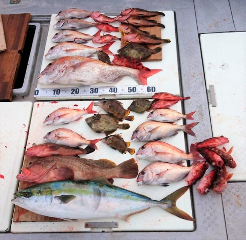 広島県呉市仁方発遊漁船七海です。 今日は一つテンヤしてきました。 今日はkymさんkwiさん達と出てきました。 朝一の一流し目から66センチの良いサイズのタイ! 潮が変わり初めには53センチのアコウに、 77センチのハマチと良型の魚が釣れて面白い一日でした。 遊漁船七海では二人体制でやっていますのでしっかりサポートさせていただきます。 初めて遊漁船に乗られる方でもお気軽にご連絡ください。 釣った魚は下処理をしてお持ち帰りいただけます。 餌のエビはシーズン中はしっかり用意させていただきます コロナ対策のためマスク着用ご協力お願いします。 釣果情報 2021/12/14 遊漁船 七海 タグ:釣果情報 , タイ , アコウ , カサゴ , 一つテンヤ , セトダイ , ハマチ , カワハギ
