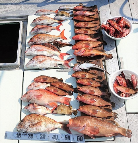 広島県呉市仁方発遊漁船七海です。 今日は一つテンヤ、タイラバしてきました。 今日はtkhrさん達と出てきました。 久しぶりにしっかり一つテンヤ。 朝一から良い感じで当たりアリ。 その後もずっと当たりアリで良い感じ。 中盤戦には50アップの良いアコウも釣れました。 一つテンヤ今から良い感じですよ。 遊漁船七海では二人体制でやっていますのでしっかりサポートさせていただきます。 初めて遊漁船に乗られる方でもお気軽にご連絡ください。 釣った魚は下処理をしてお持ち帰りいただけます。 コロナ対策のためマスク着用ご協力お願いします。 釣果情報 2022/05/08 遊漁船 七海 タグ:釣果情報 , タイ , アコウ , カサゴ , 一つテンヤ , セトダイ , グチ , コチ , コブダイ , タイラバ
