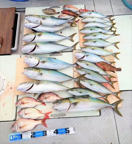広島県呉市仁方発遊漁船七海です。 タイ狙いしてきました。 今日はysdさん、Imさん達と出てきました。 スタートは久しぶりなとこから、反応ありですがなかなか喰わない。 前半はあちこち移動してポツポツでしたが 後半はハマチの群れを見つけて良い感じでした。 ハマチが多いせいがタイの喰いは今一でした。 遊漁船七海では二人体制でやっていますのでしっかりサポートさせていただきます 初めて遊漁船に乗られる方でもお気軽にご連絡ください。 釣った魚は下処理をしてお持ち帰りいただけます。 餌のエビはシーズン中はしっかり用意させていただきます 釣果情報 2022/09/24 遊漁船 七海 タグ:釣果情報 , タイ , アコウ , ヤズ , カサゴ , ハマチ , カワハギ , タイサビキ
