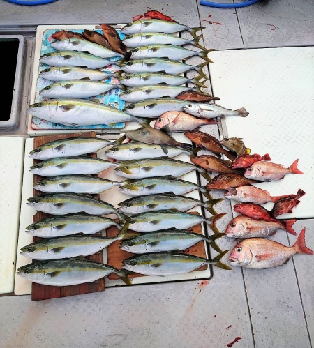 広島県呉市仁方発遊漁船七海です。 今日はタイ狙いでした。 今日はタイ狙いしてきました。 スタートから反応はしっかり。 タイ狙いで出ましたが、ガッツリ青物。 型はまあまあですが、いくらでも釣れる。 場所を変えてみるとポツポツ、タイとアコウが釣れてくれました。 反応良くなったなと思ったら。ハマチサイズも出て楽しめました。 遊漁船七海では二人体制でやっていますのでしっかりサポートさせていただきます 初めて遊漁船に乗られる方でもお気軽にご連絡ください。 釣った魚は下処理をしてお持ち帰りいただけます。 餌のエビはシーズン中はしっかり用意させていただきます 釣果情報 2022/12/11 遊漁船 七海 タグ:釣果情報 , タイ , アコウ , ヤズ , カサゴ , セトダイ , ウマヅラハギ , グチ , ハマチ , タイサビキ , SLJ , 青物サビキ
