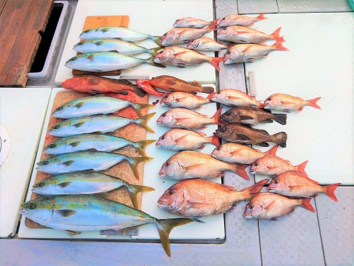 広島県呉市仁方発遊漁船七海です。 タイ、ハマチ狙いしてきました。 今日はswmtさん、村さん、達と出てきました。 スタートからアタリはポツポツ。 中盤はタイが良く当たってくれ 後半にかけてはタイ、ハマチと混じって良く当たってくれました。 遊漁船七海では二人体制でやっていますのでしっかりサポートさせていただきます。 初めて遊漁船に乗られる方でもお気軽にご連絡ください。 釣った魚は下処理をしてお持ち帰りいただけます。 餌のエビはシーズン中はしっかり用意させていただきます 釣果情報 2022/12/29 遊漁船 七海 タグ:釣果情報 , タイ , アコウ , ヤズ , メバル , カサゴ , ハマチ , タイサビキ , 青物サビキ
