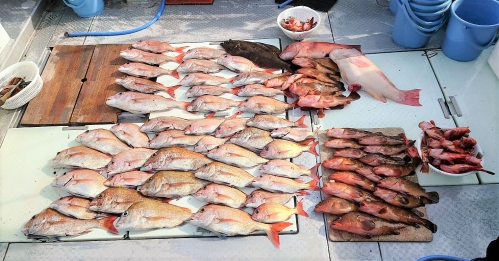 広島県呉市仁方発遊漁船七海です。 一つテンヤしてきました。 今日はたーさん、福君達と出てきました。 朝から一つテンヤ。 一流し目からめちゃくちゃ当たる。 タイ、アコウ、おまけにヒラメまで。 潮の緩みには56センチを頭にアコウが結構良い感じに。 後半はタイが入れ食いで楽しめました。 遊漁船七海では二人体制でやっていますのでしっかりサポートさせていただきます。 初めて遊漁船に乗られる方でもお気軽にご連絡ください。 釣った魚は下処理をしてお持ち帰りいただけます。 餌のエビはシーズン中はしっかり用意させていただきます 釣果情報 2023/05/27 遊漁船 七海 タグ:釣果情報 , タイ , アコウ , カサゴ , 一つテンヤ , セトダイ , グチ , コチ , ヒラメ , コブダイ