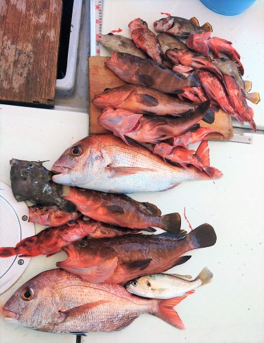 広島県呉市仁方発遊漁船七海です。 一つテンヤしてきました。 今日はhsmtさん達と出てきました。 スタートは昨日と同じところから。 当たるけどなかなか掛からない。 ウロウロしながらポツポツは釣れるけど 続かず、一日いいとこなしでした。 遊漁船七海では二人体制でやっていますのでしっかりサポートさせていただきます。 初めて遊漁船に乗られる方でもお気軽にご連絡ください。 釣った魚は下処理をしてお持ち帰りいただけます。 餌のエビはシーズン中はしっかり用意させていただきます 釣果情報 2023/07/23 遊漁船 七海 タグ:釣果情報 , タイ , アコウ , カサゴ , 一つテンヤ , セトダイ , ギザミ , グチ , コブダイ